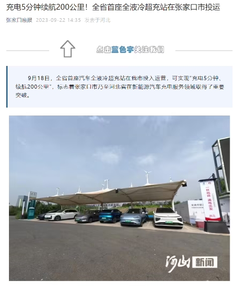 9 月 24 日消息,据“张家口晚报”公众号报道,河北首座全液冷超充站于 9 月 18 日在张家口市投运,可实现“充电 5 分钟、续航 200 公里”。