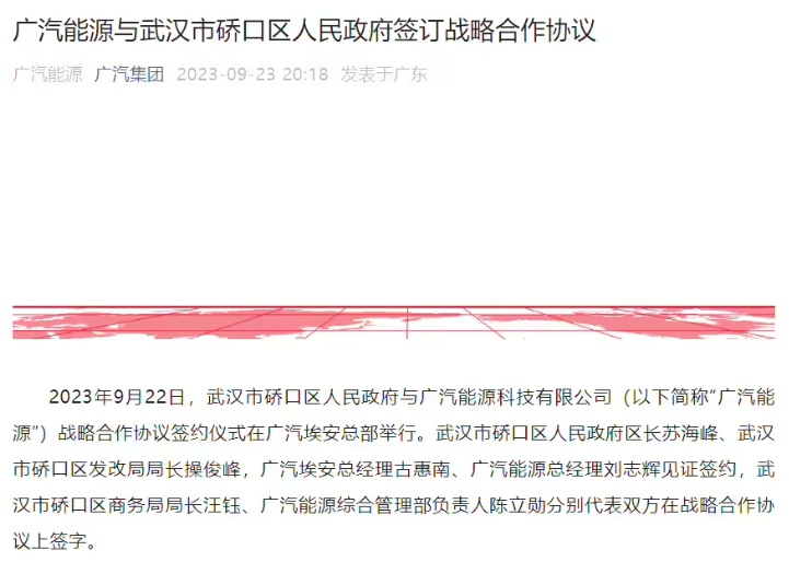 9 月 24 日消息,武汉市硚口区人民政府与广汽能源战略合作协议签约仪式,未来三年,硚口区拟新增充电桩 6000 个,同步建设集中充电场站 50 座,换电站 10 座。