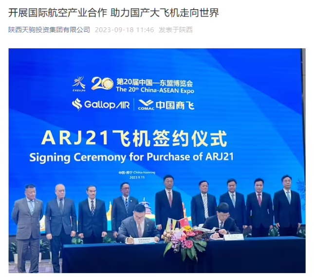 在广西南宁的第 20 届中国-东盟博览会上,文莱骐骥航空(GallopAir)与中国商飞签署了 30 架飞机的采购意向书,包括 C919、ARJ-21 两种型号。