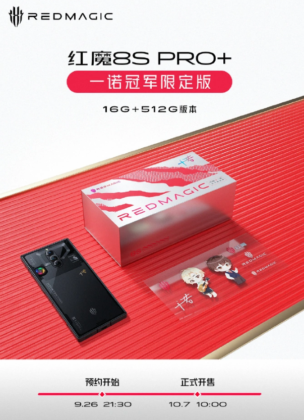此外IT之家注意到,红魔 8S Pro + 的 16+512GB 一诺冠军限定版也于今日开售,价格 5999 元,新手机采用全系礼盒装,包装和机身上都有一诺的签名,还附赠有一诺的卡通形象。
