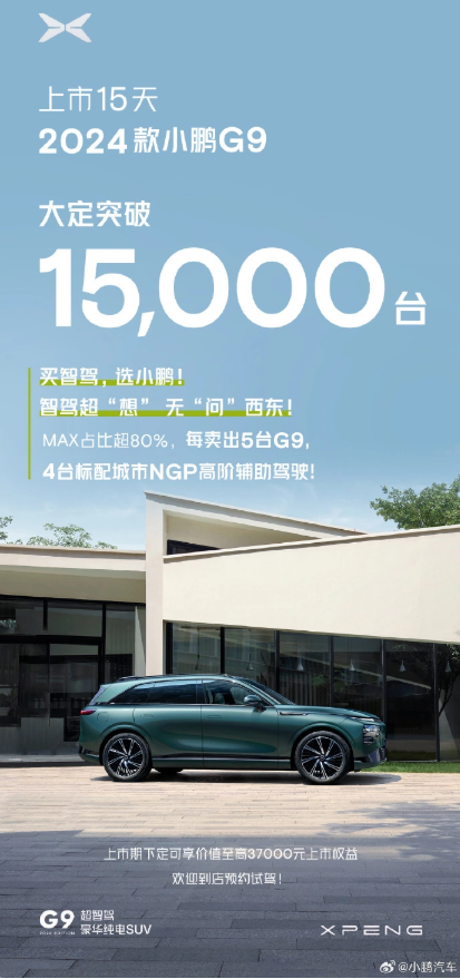 原标题:2024 款小鹏 G9 车型上市 15 天大定破 15000 辆,MAX 版本占比超过 80%