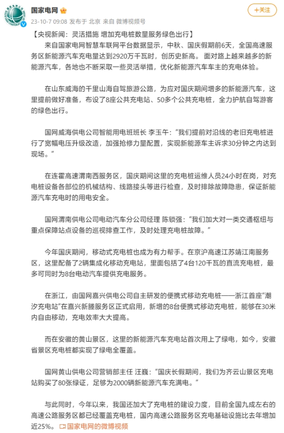 10 月 7 日消息,据国家电网、央视新闻等近日报道,来自国家电网智慧车联网平台的数据显示,在今年中秋、国庆假期前 6 天,全国高速服务区新能源汽车充电量达到 2920 万千瓦时,创下历史新高。