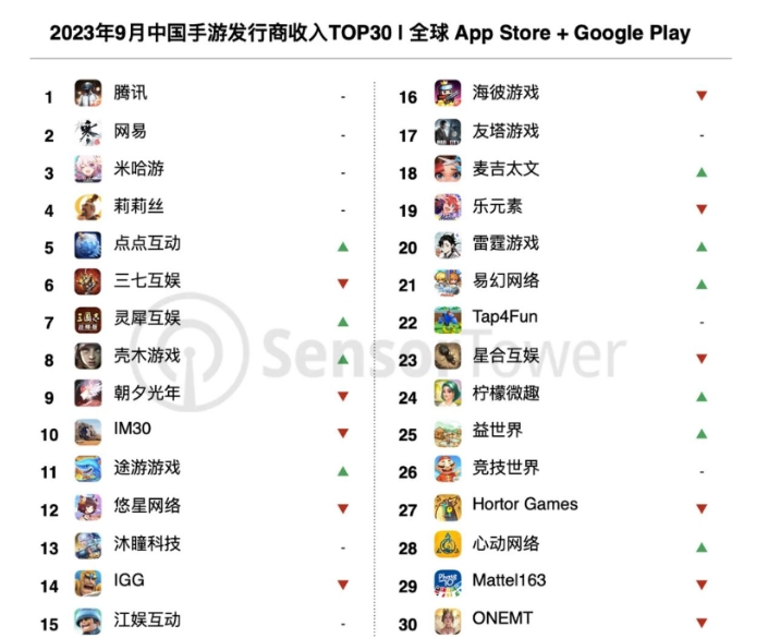 9 月中国手游发行商全球收入排行榜 TOP 10: