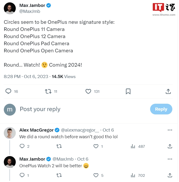 10 月 8 日消息,据爆料者 Max Jambor 透露,一加 Watch 2 将于 2024 年推出,采用圆形设计,他还声称 Watch 2“效果会更好”。