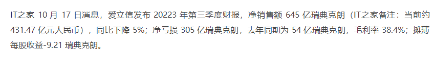 10 月 17 日消息,爱立信发布 20223 年第三季度财报,净销售额 645 亿瑞典克朗(IT之家备注:当前约 431.47 亿元人民币),同比下降 5%;净亏损 305 亿瑞典克朗,去年同期为 54 亿瑞典克朗,毛利率 38.4%;摊薄每股收益-9.21 瑞典克朗。