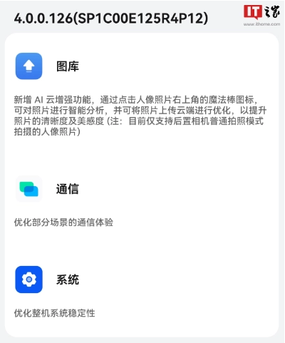 新增 AI 云增强功能,通过点击人像照片右上角的魔法棒图标,可对照片进行智能分析,并可将照片上传云端进行优化,以提升照片的清晰度及美感度(注:目前仅支持后置相机普通拍照模式拍摄的人像照片)。