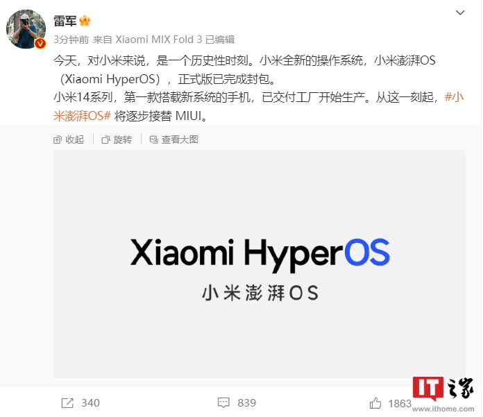 10 月 18 日消息,小米昨日正式公布了新系统澎湃 OS(HyperOS)的名称,基于 Android + 自研 Vela 系统融合,将在小米 14 系列手机上首发搭载。然而新系统的细节暂未公布。