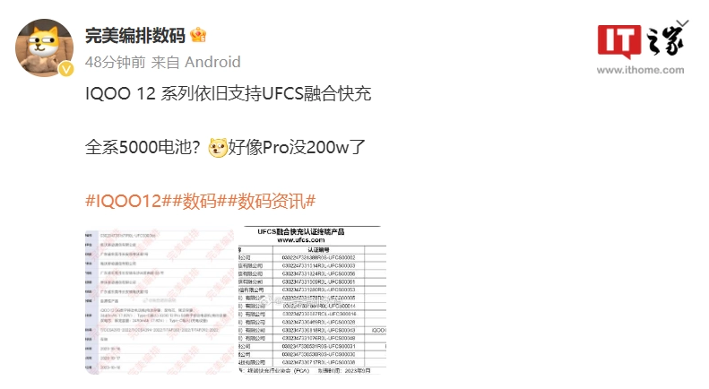 原标题:iQOO 12 / Pro 手机全系支持 UFCS 融合快充,Pro 版无缘 200W 功率