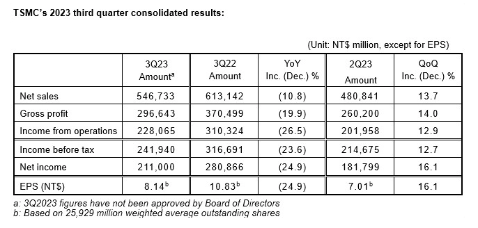 10 月 19 日消息,台积电 10 月 19 日公布第三季度业绩,第三季度净营收 5467.3 亿元新台币,同比下降 10.8%,环比增长 13.7%;第三季度净利润 2108.0 亿元新台币,同比下降 25.0%,环比增长 16.0%。