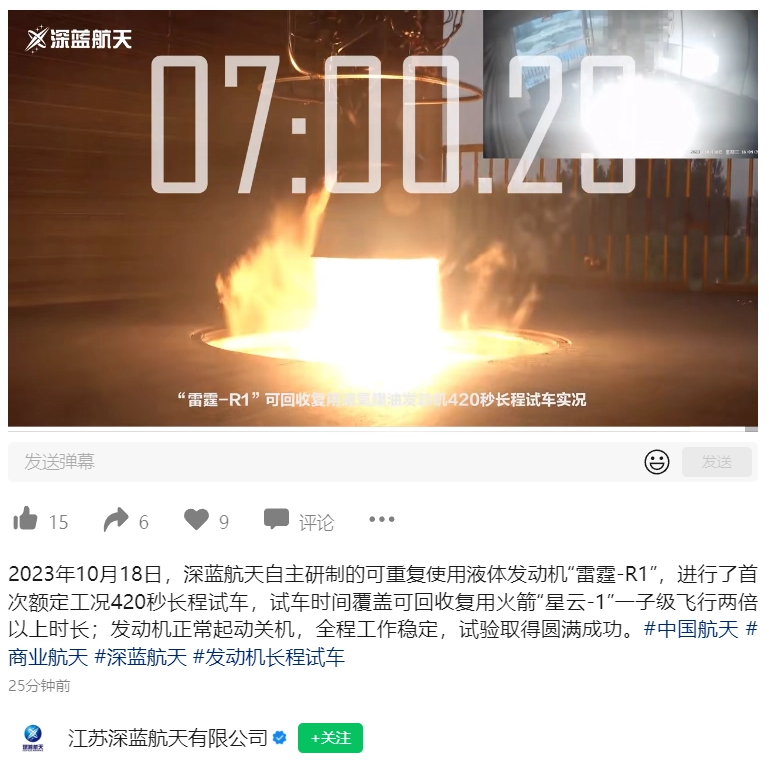 10 月 23 日消息,江苏深蓝航天有限公司宣布,近日,深蓝航天自主研制的可重复使用液体发动机“雷霆-R1”,进行了首次额定工况 420 秒长程试车。