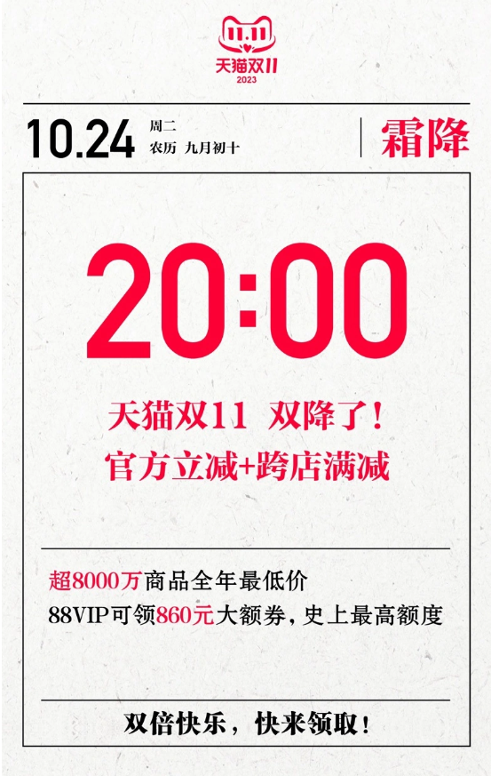 10 月 24 日消息,今晚 8 点,2023 天猫双 11 预售正式开启。天猫称今年双 11 将为消费者带来“双降”的快乐:在跨店满 300 减 50 的基础上,增加了官方立减直降商品,满足凑单党和一键下单党的不同需求。