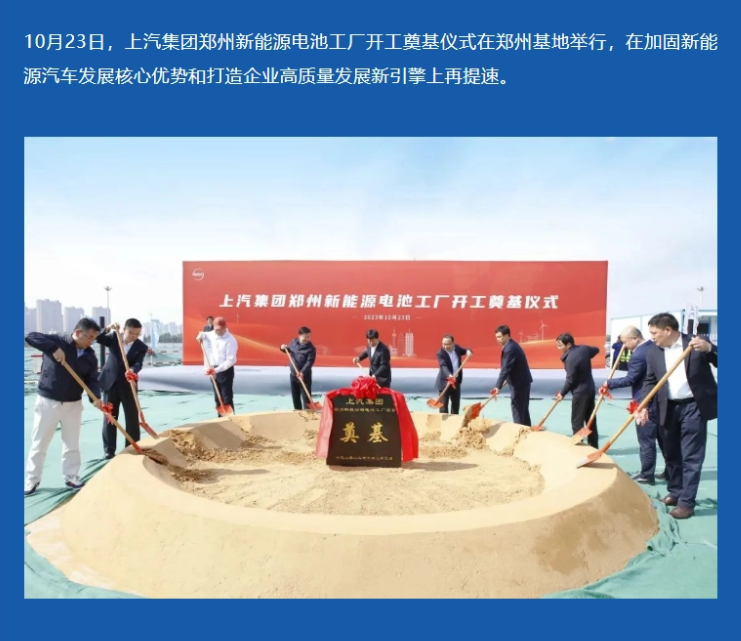 10 月 24 日消息,上汽集团郑州新能源电池工厂开工奠基仪式在郑州基地举行,该动力电池项目于 7 月在郑州市经开区启动。据悉,该项目总投资 20 亿元,规划 30 万台套动力电池产能,投产后年产值超 100 亿元。