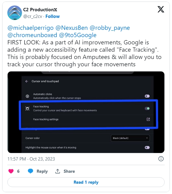 10 月 24 日消息,根据网友 @cr_C2cv 分享的最新内容,谷歌计划在 ChromeOS 中引入名为“面部追踪”(Face tracking)功能,开启后可以通过追踪用户面部,来操控鼠标和键盘。