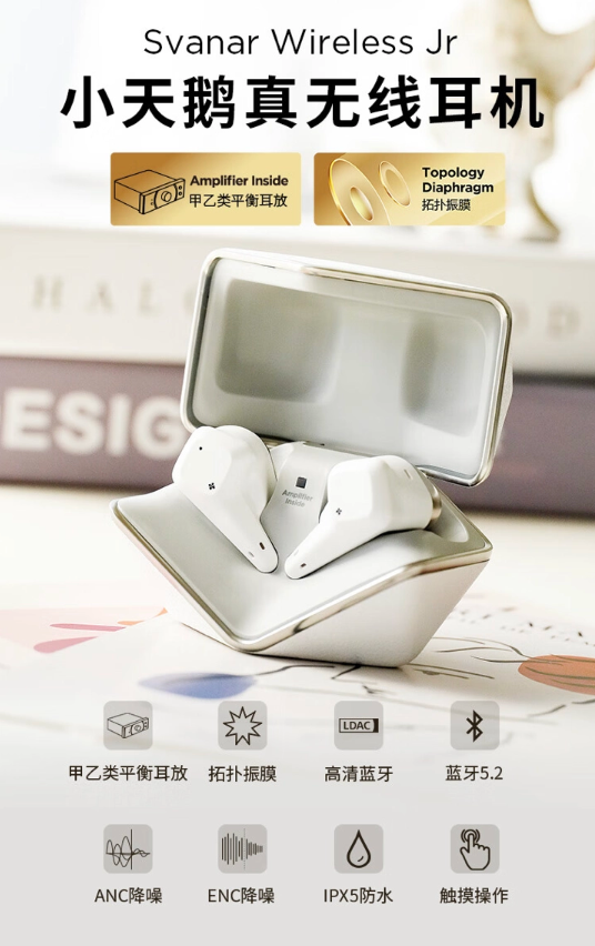 10 月 24 日消息,海飞曼(HIFIMAN)今天在电商平台上架了一款名为“Svanar Wireless Jr”的“小天鹅真无线耳机”,号称采用“甲乙类平衡耳放”、“拓扑振膜”,支持蓝牙 5.2、ANC 及 ENC 降噪,可实现 IPX5 防水,售价 1098 元。