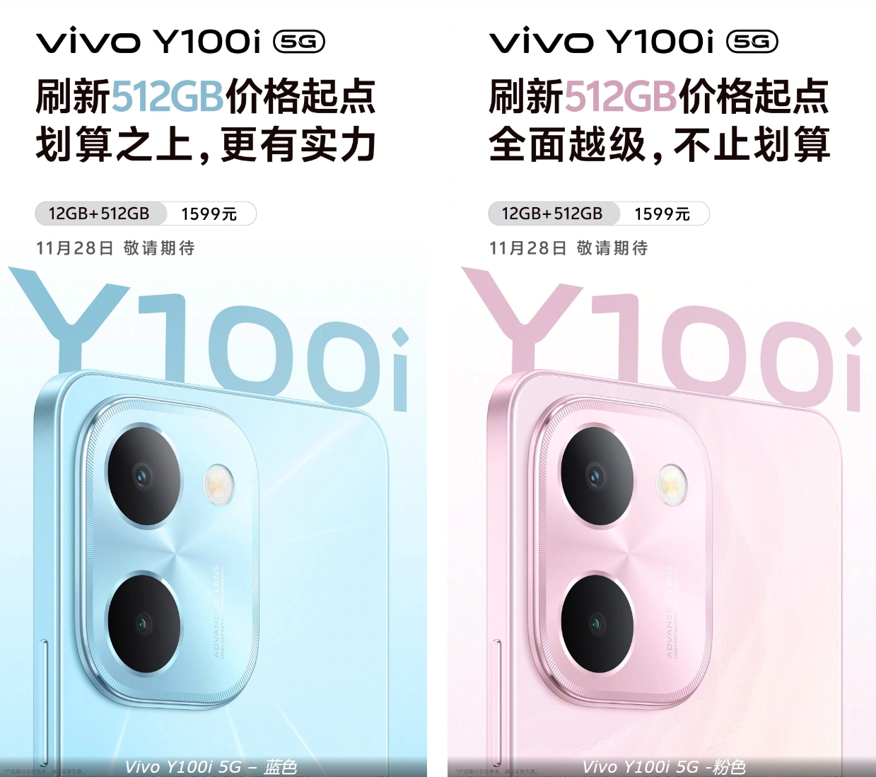 Vivo Y100i 5G 有两种颜色可供选择:蓝色和粉红色。这款智能手机的售价为 1599 元人民币(220 美元),将于 2023 年 11 月 28 日发售。