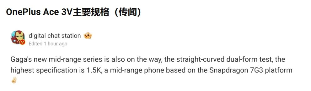 据泄密者称,OnePlus 正在开发一款配备骁龙 7 Gen 3 芯片组的 Ace 品牌手机。他补充说,该设备将配备一个提供1.5K分辨率的平面显示器。虽然他没有提到该设备的名称,但似乎它将在上市时作为OnePlus Ace 3V销售。