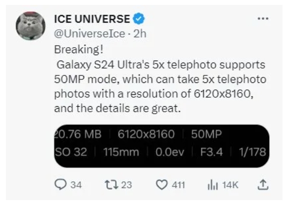 随着三星 Galaxy S24 系列即将于 2024 年 1 月 17 日发布,谣言和泄密变得更加频繁。如今,泄漏甚至详细说明了即将推出的 Galaxy 旗舰智能手机的相机、设计和性能的微小变化。同样,X.com(前身为 Twitter.com)上的著名提示者@IceUniverse证实了其 50 倍长焦镜头存在 5 MP 模式,这将导致高分辨率输出。准确地说,Galaxy S24 Ultra 的 5 倍长焦镜头将能够拍摄 6120 x 8160 像素的照片。