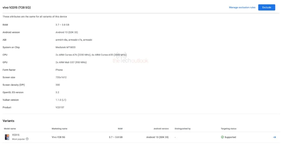 Vivo Y28 5G 已列入 Google Play 控制台认证,型号为 V2315。手机的渲染图显示了一个水滴缺口和一个厚厚的下巴。同时,后面板采用双色调设计,带有两个摄像头环。