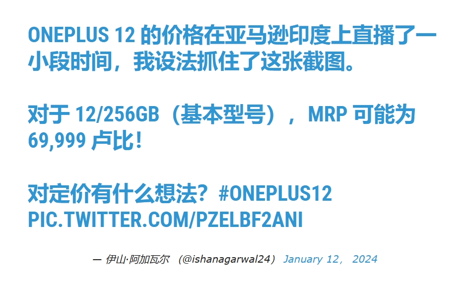 提示者 Ishan Agarwal 发现了 OnePlus 12 在印度亚马逊上的列表。它现在已被删除。他在X(前身为Twitter)上分享的屏幕截图揭示了即将推出的旗舰产品的关键信息。OnePlus 12 配备 12GB RAM 和 256GB 存储空间。它的价格为 69,999 卢比。值得注意的是,这是MRP,实际零售价可能会更低。