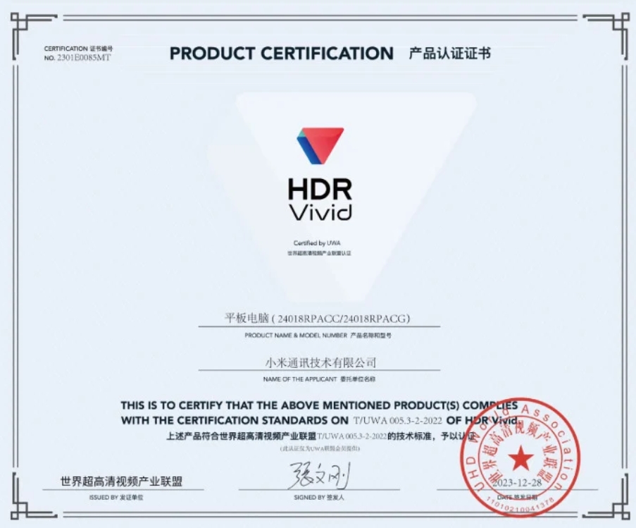 有趣的是,同一台设备以及潜在的全球变体(型号 24018RPACG)也获得了 HDR Vivid 认证。这表明这款平板电脑可以拥有支持高动态范围(HDR)的显示屏,有望提供更丰富、更生动的视觉效果。
