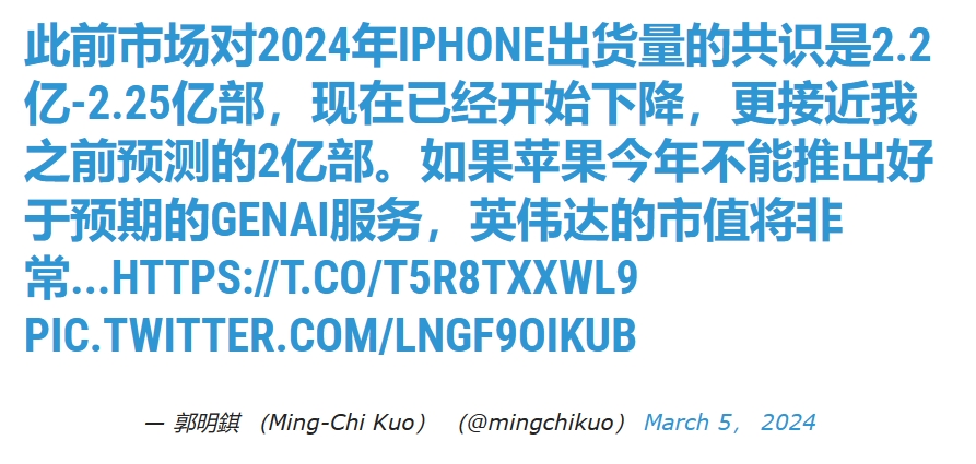 如果苹果的人工智能计划失败或没有达到预期,这家总部位于库比蒂诺的科技巨头可能会失去对英伟达的宝贵公司地位。这是分析师郭明錤(Ming-Chi Kuo)的说法。他补充说,苹果预计今年的出货量将在2.2亿至2.25亿台之间,但现在预测已经开始下降。到今年年底,该公司的出货量可能接近2亿。
