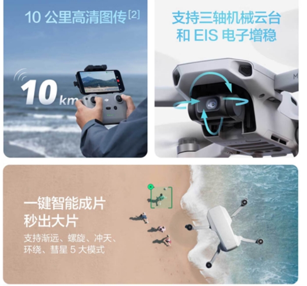 对于经济实惠的无人机,Mini 4K 具有一些壮观的功能,例如三轴机械万向节和电子图像稳定 (EIS)。它还支持一键短片和全景照片等智能拍摄模式,因此新手也可以轻松打造航拍大片。它还支持一键式短视频拍摄以及淡入淡出、螺旋、翱翔、环绕和彗星模式。只需在屏幕上轻点两下,Mini 4K 就会自动拍摄并生成带有多个可用滤镜和配乐的短视频。用户可以直接分享或在应用程序中编辑视频。测得的图像传输距离可达10公里。
